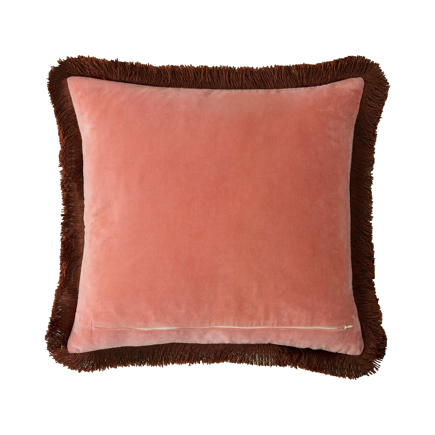 This intricate pattern features white blackthorn blossom and violets with meadow flowers of red snakes head fritillaries and yellow daisies, set against a bold background. Printed onto a sophisticated, linen-look cotton base, this luxurious fringed cushion is paired with a contemporary, cotton velvet reverses in an eye-catching coral shade.