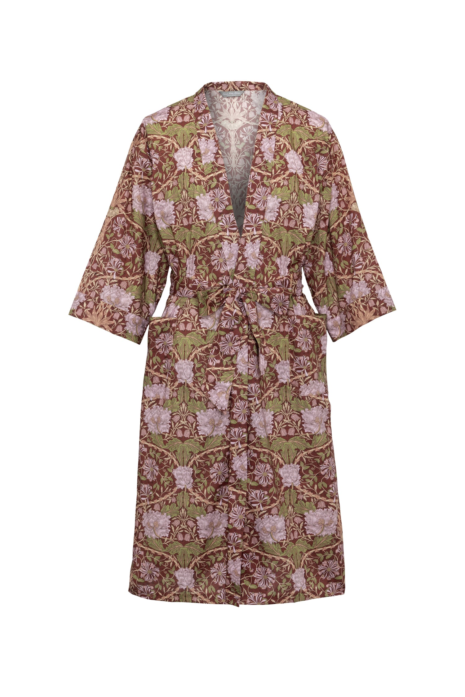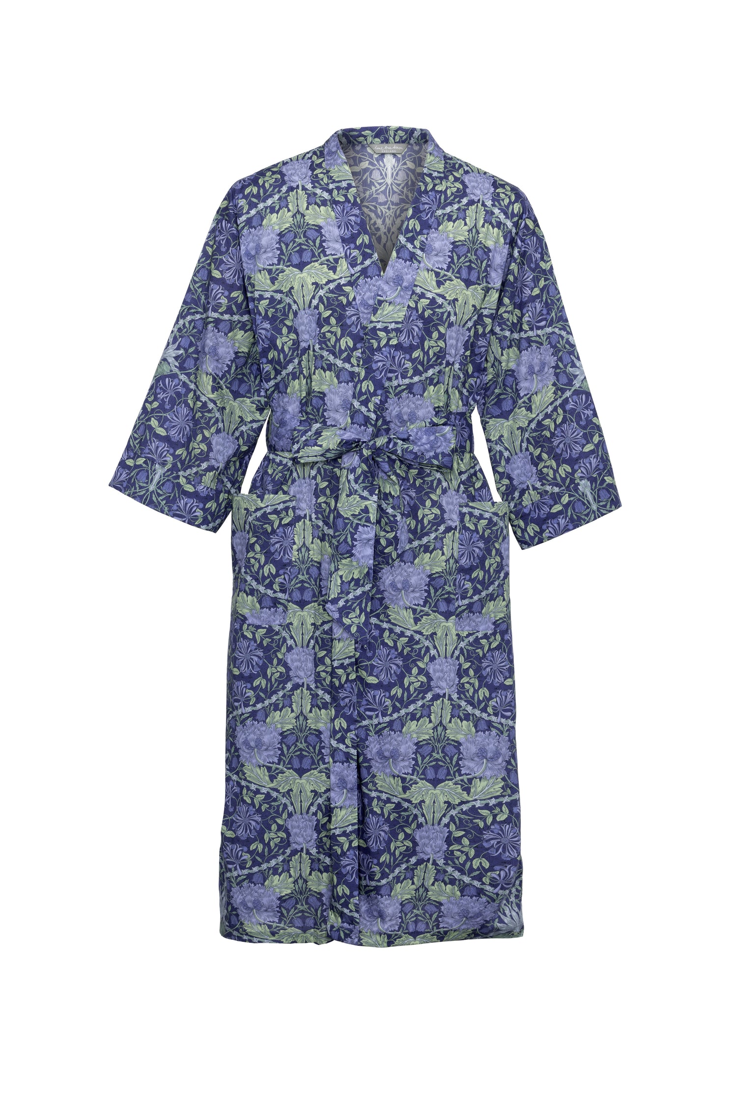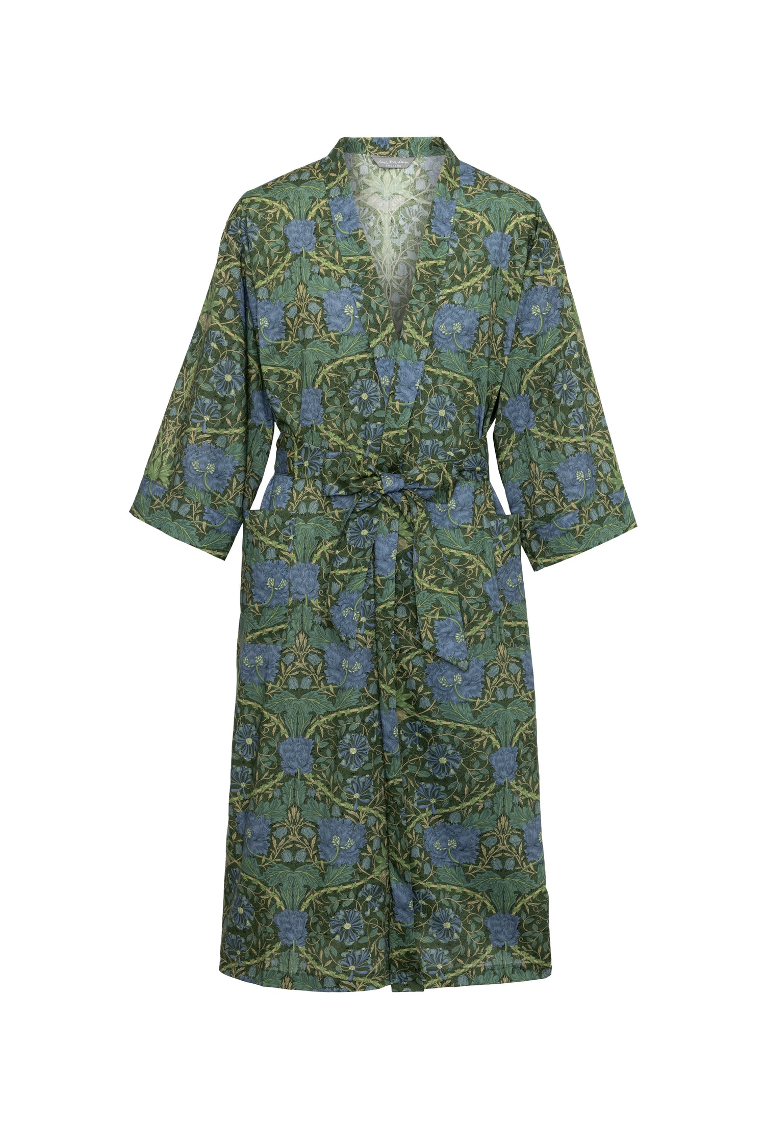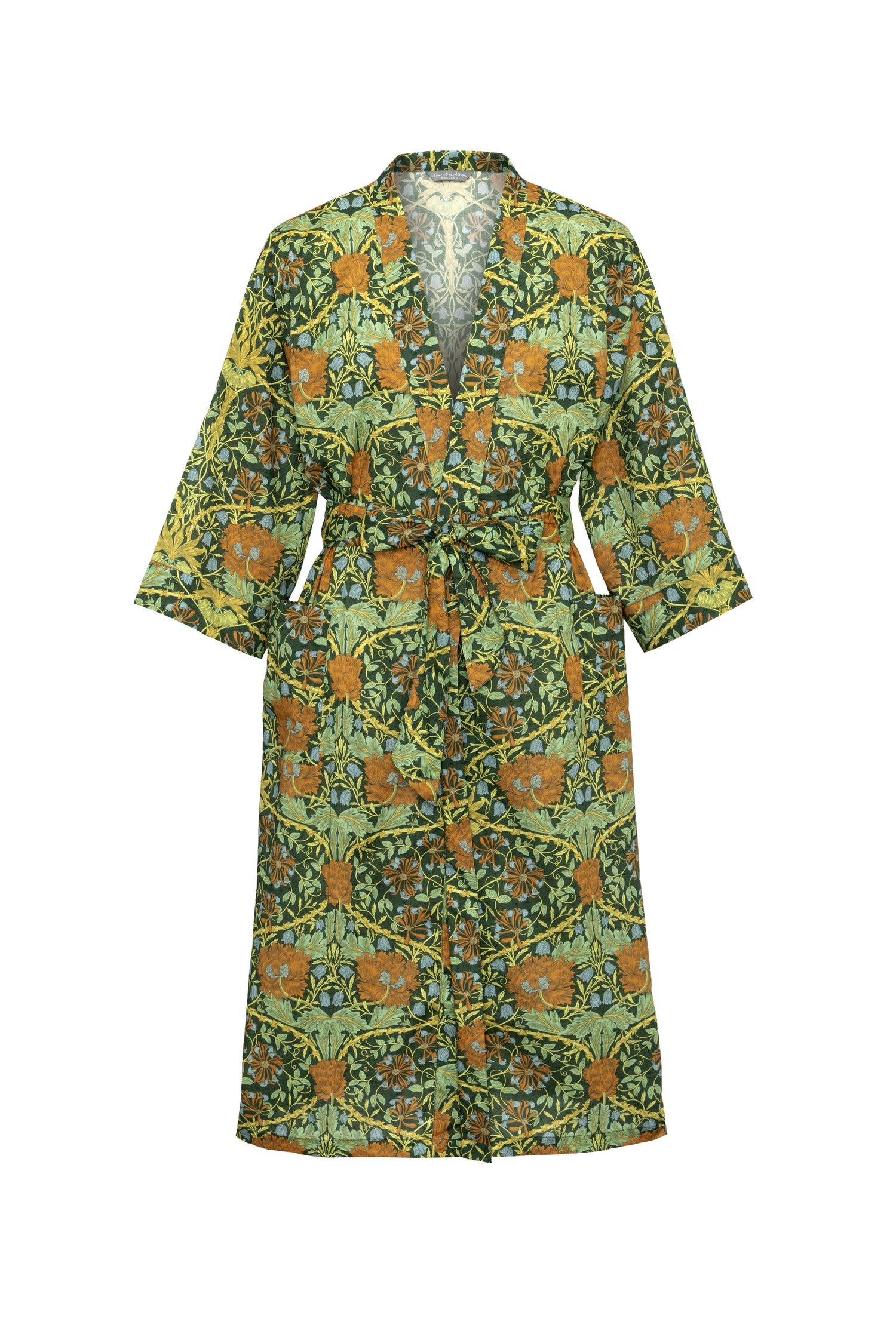 This robe has been created exclusively for the William Morris Gallery and takes inspiration from William Morris's design Honeysuckle, which features as part of the gallery's archive. Designed by William Morris in 1876, his daughter May Morris described Honeysuckle as ‘the most truely “Morrisian” in character of all his-pattern making in later life”. The pattern combines four of his favourite flowers for pattern making- crown imperial, tulip, honeysuckle and fritillary, which overlay a dense background of yew.