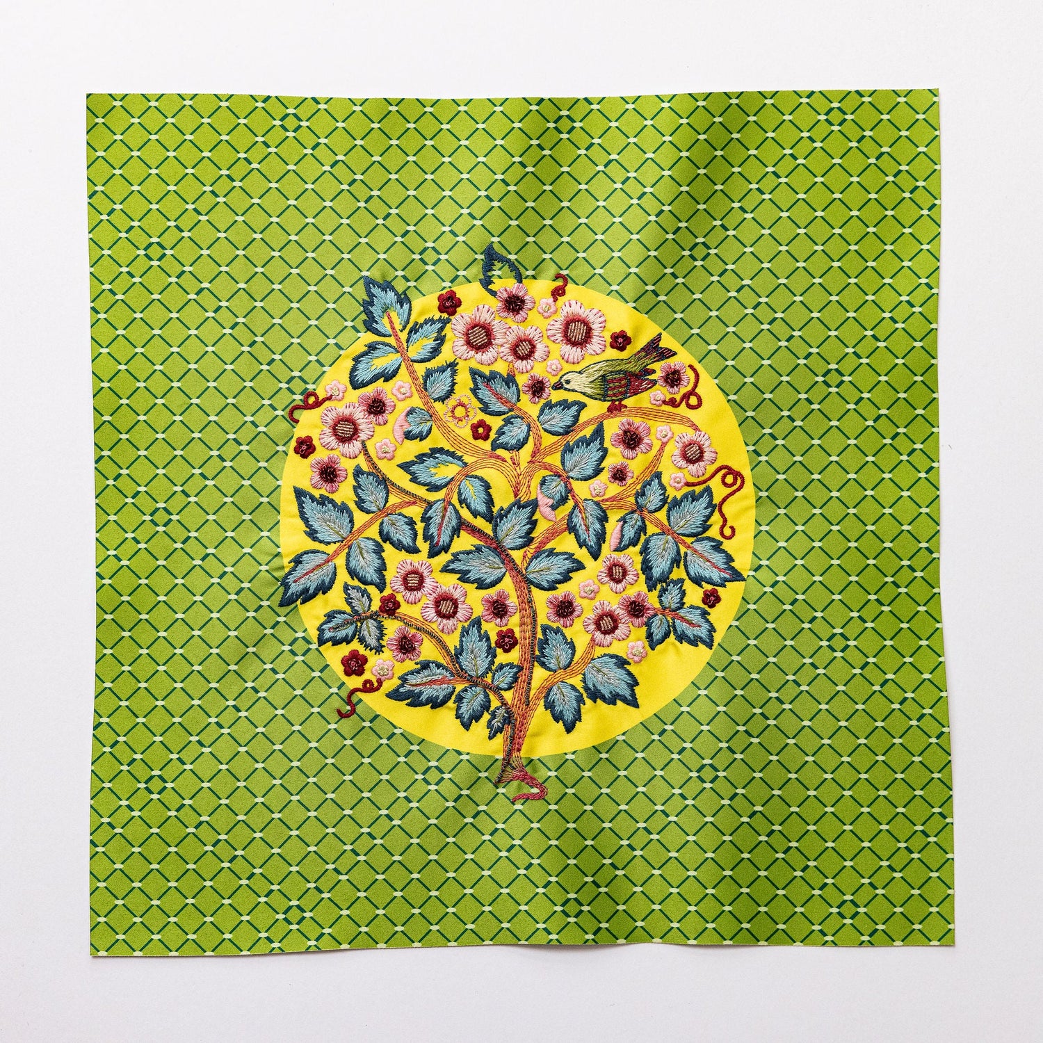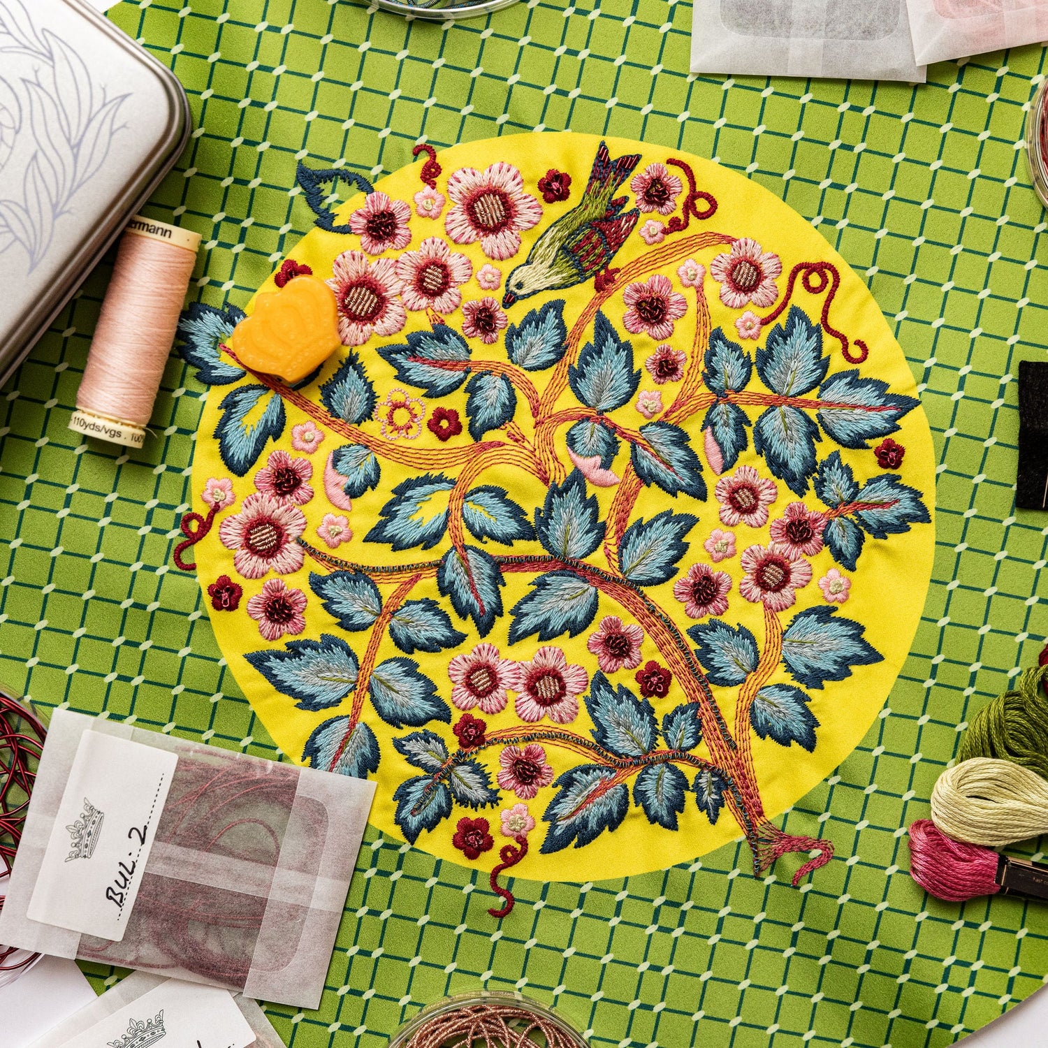 The kit’s vibrant floral design draws on Rose Wreath, an original William Morris cushion cover embroidered by May around 1890 and showcased at the Arts and Crafts exhibition that year.
