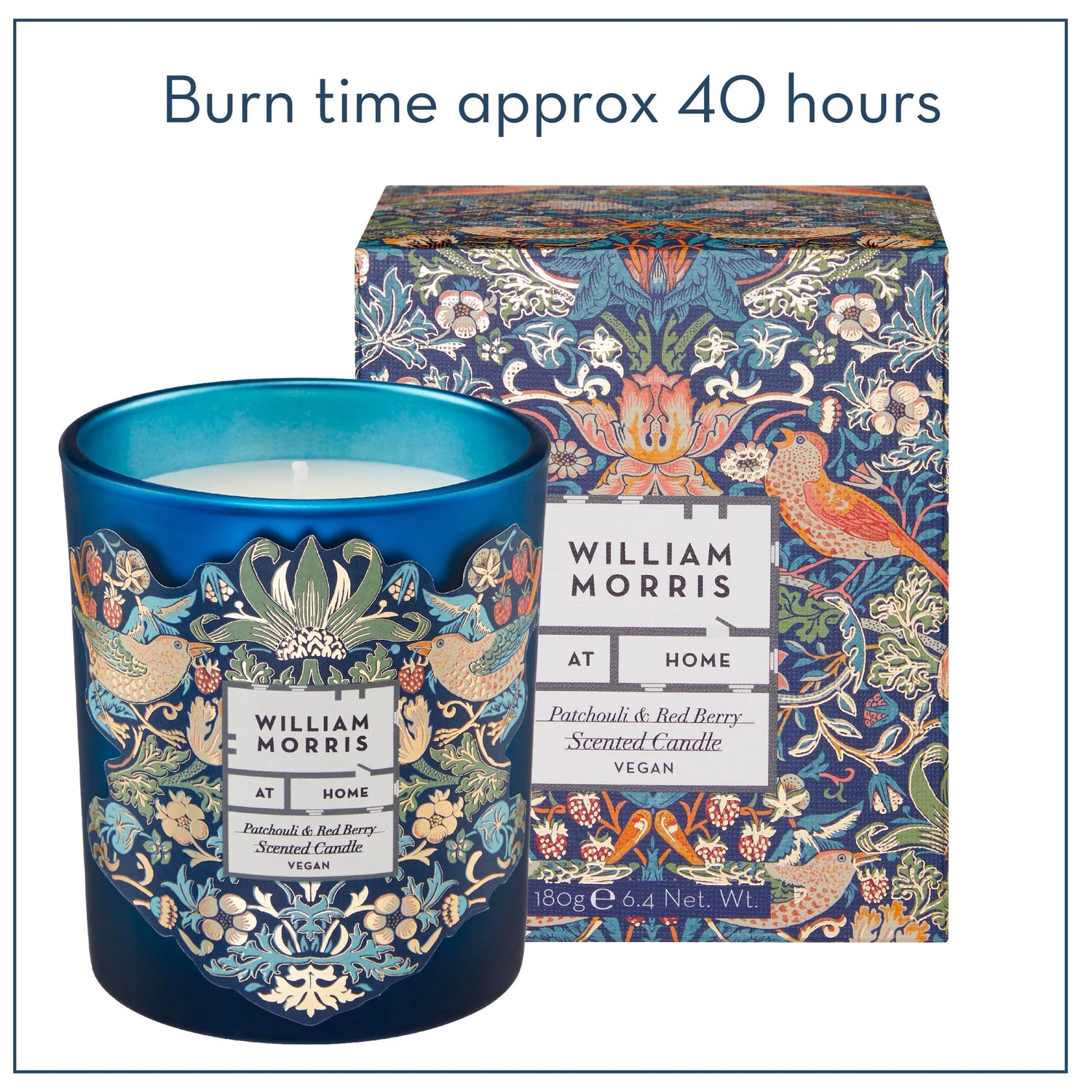 The scented candle is poured into a jewel-like blue glass jar with the iconic Strawberry Thief design and makes a statement home decor piece. When the candle has finished the jar can be repurposed as a posy vase or make-up brush caddy or however you wish.